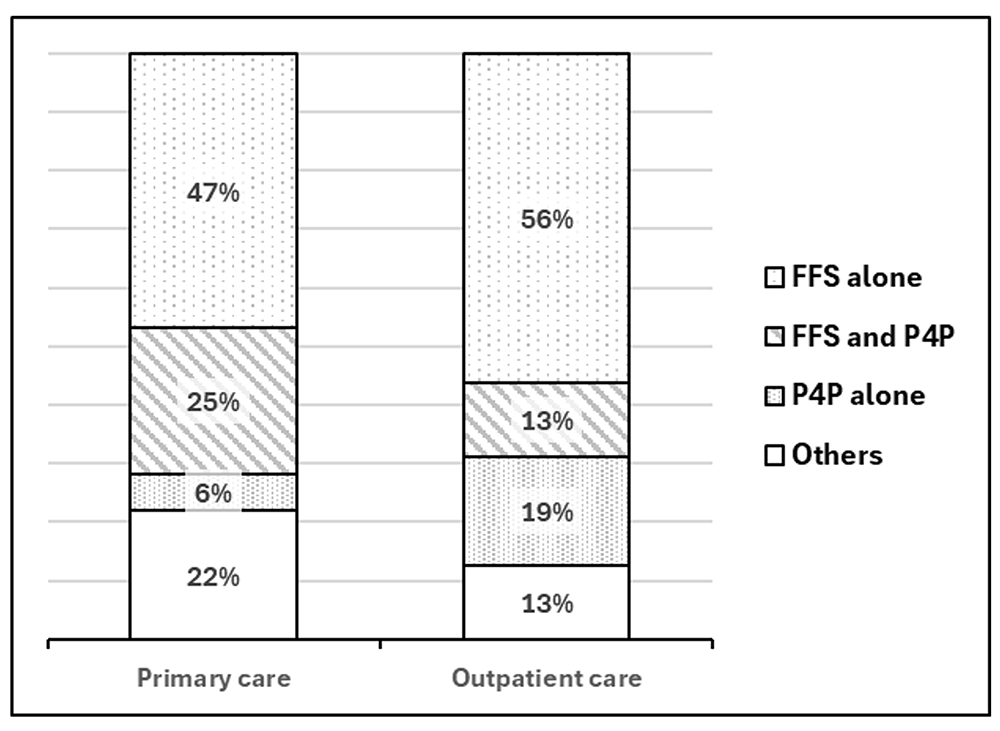 According to a survey conducted by the OECD among its 32 member countries, 47% use FFS alone for the reward-payment scheme in primary care, and 56% use FFS alone in outpatient care (Figure). In other words, this indicates that FFS remains the international mainstream of the reward-payment scheme, even today. On the other hand, the total number of countries using P4P alone or P4P with FFS has been increasing, achieving 31% in primary care and 32% in outpatient care.