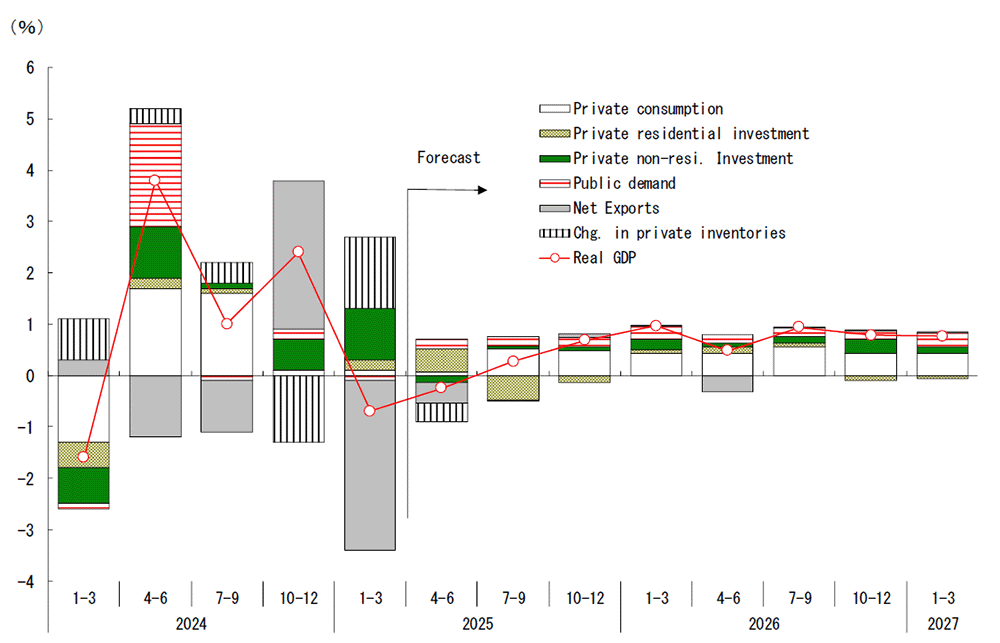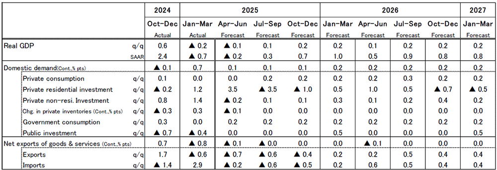 In 2Q 2025, the negative impact of the Trump tariffs is expected to become apparent, and the economy is expected to experience two consecutive quarters of negative growth. Although the additional reciprocal tariffs have been temporarily suspended, the basic tariff rate of 10% remains in place, and item-specific tariffs—such as the 25% rate on automobiles—are being maintained. In addition to the likely decline in exports to the U.S., particularly automobiles, exports to countries other than the United States are also expected to remain weak in light of the anticipated slowdown in the global economy. Furthermore, with the rapid and frequent changes in the tariff environment, uncertainty about the outlook has increased significantly, which is likely to result in restrained capital investment both domestically and overseas. In addition, real wages are expected to continue declining in 2Q, mainly due to rising prices, and consumer sentiment is deteriorating. As a result, personal consumption is likely to remain subdued following the stagnation observed in 1Q.