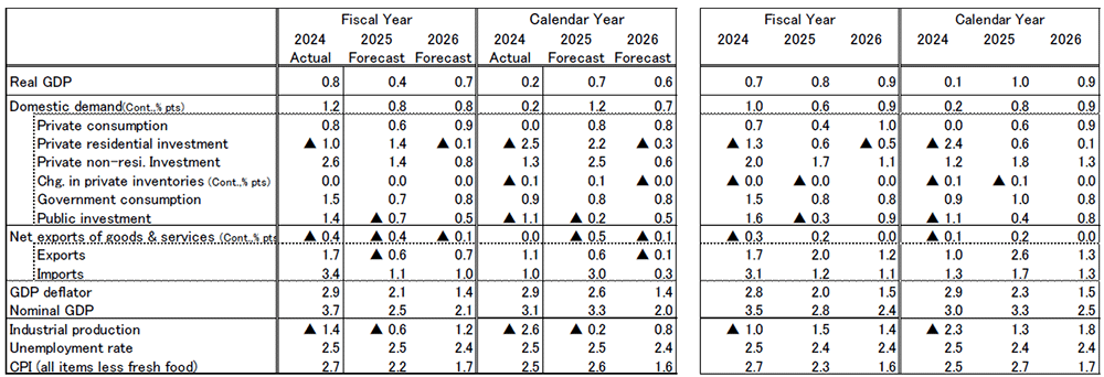 We expect the Japanese economy to grow by +0.4% in FY2025 and +0.7% in FY2026. On a calendar-year basis, real GDP growth is projected at +0.7% in 2025 and +0.6% in 2026. We have substantially revised down our economic outlook, taking into account the negative impact of tariff increases under President Trump.