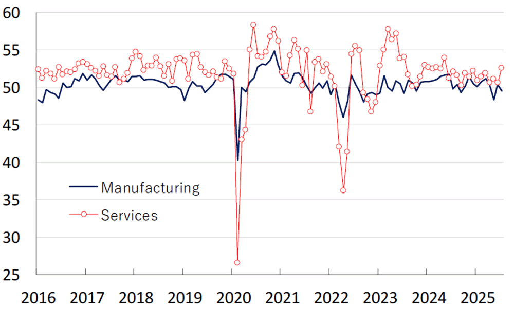 In sum, despite the implementation of higher U.S. tariffs, there are currently no clear, immediate signs of dynamics that would directly trigger an economic downturn. While the April announcement of the tariffs initially stoked fears of a sharp slowdown, a combination of tempered messaging from President Trump, the unexpectedly resilient U.S. economy, and Japanese firms' curbs on price pass-through has left Japan's domestic performance exceeding earlier projections.