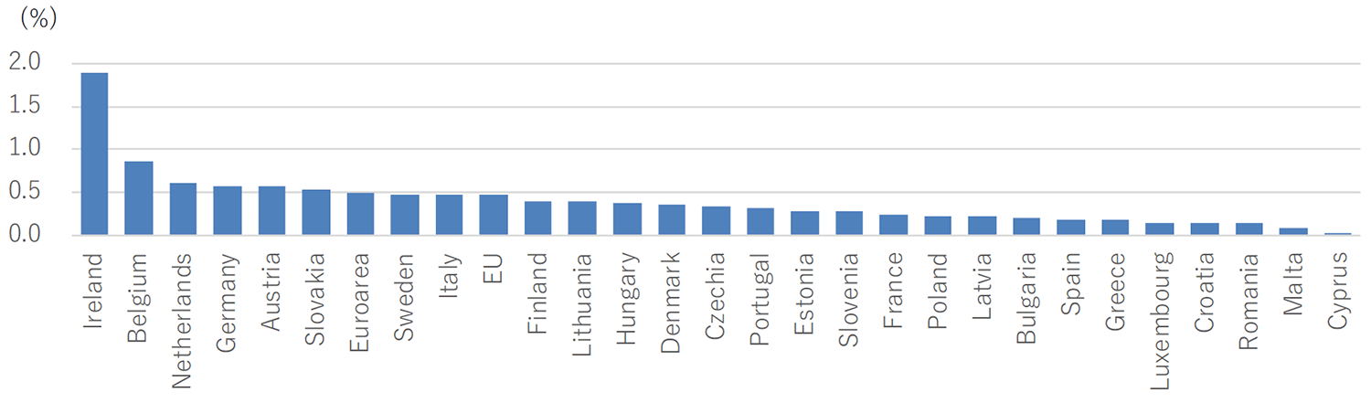 In the January-March quarter, the eurozone economy outperformed expectations due to a surge in exports ahead of the US tariff hike and Ireland's high growth, which was driven by the economic activities of multinational companies. Although the economy slowed down in the April-June period as a reaction to this, it managed to maintain positive growth. Until now, uncertainty surrounding tariff negotiations has been a drag on economic activity, but the United States and the European Union (EU) reached a broad agreement on tariff rates and other issues at the end of July. The United States will impose a flat 15% tariff on imports from the EU, including its mainstays of automobiles and pharmaceuticals, while the United States and the EU will mutually eliminate tariffs on items such as aircraft and certain pharmaceuticals. The EU has also committed to expanding imports of U.S. energy and military equipment and increasing investment in the United States. While punitive high tariffs and retaliatory measures have been avoided, the impact on European exporters is unavoidable.