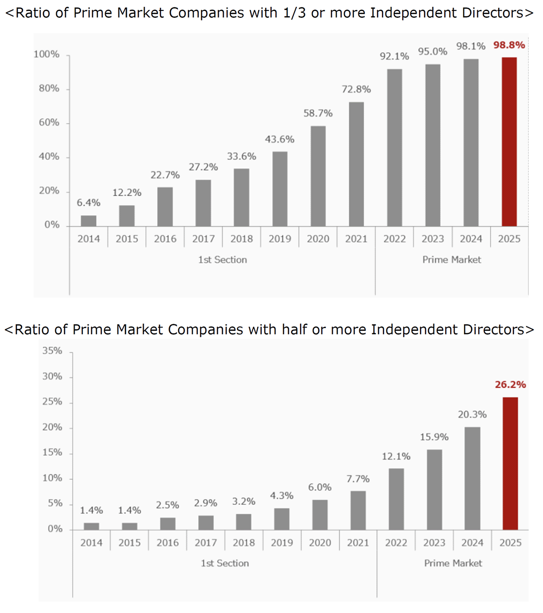 - Under Principle 4-8 of the current Corporate Governance Code, companies listed on the Prime Market are required to appoint independent outside directors constituting at least one-third of the board. This principle was strengthened in the 2021 revision, replacing the previous requirement of appointing “at least multiple” independent outside directors.