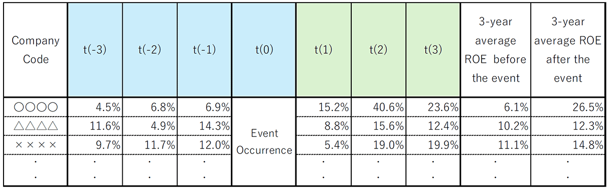 In this analysis, the measurement window is defined as the three-year pre-event period and the three-year post-event period following the event. For each firm, the average ROE over the three years prior to the event and the average ROE over the three years after the event are calculated. A statistical test is then conducted to determine whether there is a significant change in the three-year average ROE between the pre-event and post-event periods—that is, whether an increase in ROE can be statistically confirmed.