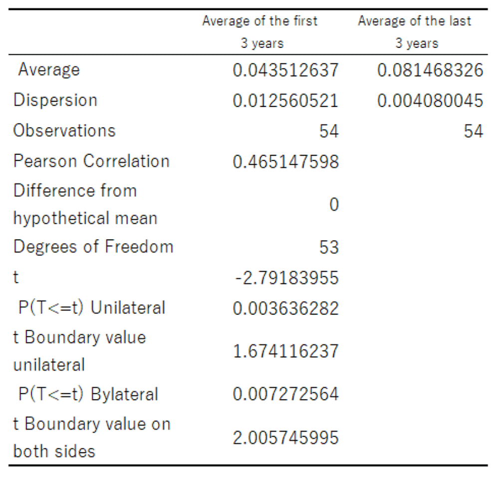 The results of the t-test indicate that the one-sided p-value is 0.003636, confirming that the difference between the pre-event and post-event three-year average ROE is statistically significant at the 1 percent level. In other words, for firms that were considered to have room for improvement in profitability and that experienced the event of appointing a majority of independent outside directors, the three-year average ROE after the event is statistically higher than the three-year average ROE before the event.