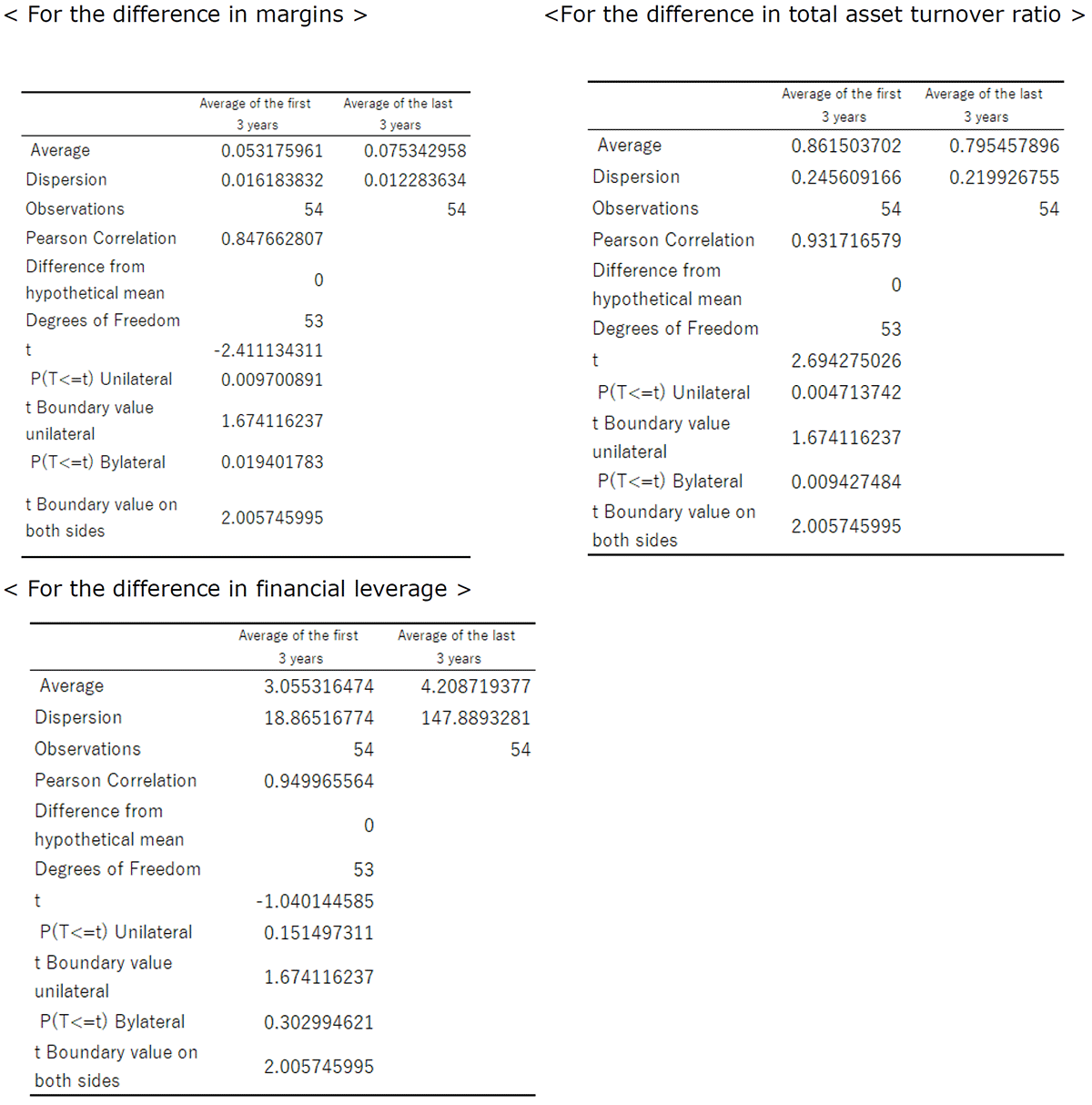 When a statistically significant improvement in ROE is observed, a DuPont decomposition (Note 7) is applied to examine through which structural channels ROE increased. Specifically, the analysis decomposes ROE into its constituent components—profit margin, total asset turnover, and financial leverage—and evaluates changes in each component using both mean-difference tests comparing pre- and post-event three-year averages and multiple regression analysis.