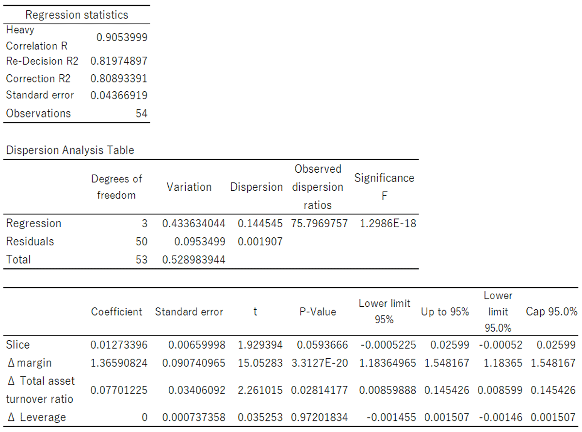 Building on the statistically significant changes in three-year average profit margins and total asset turnover identified in the previous subsection, a multiple regression analysis (Note 12) is conducted. In this analysis, the dependent variable is defined as the difference between the post-event and pre-event three-year average ROE for the 54 firms in the sample. The explanatory variables are defined as the corresponding differences in the three-year average values of profit margin, total asset turnover, and financial leverage for the same firms.