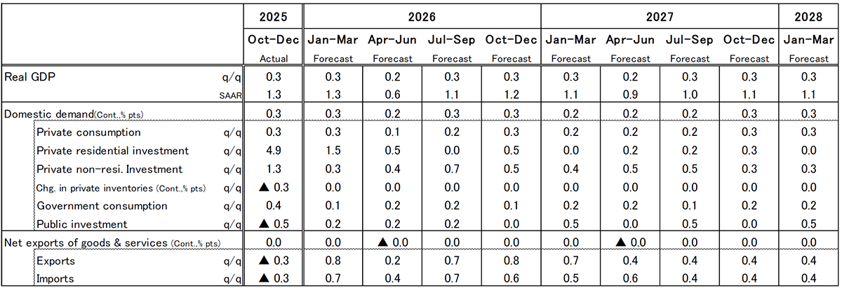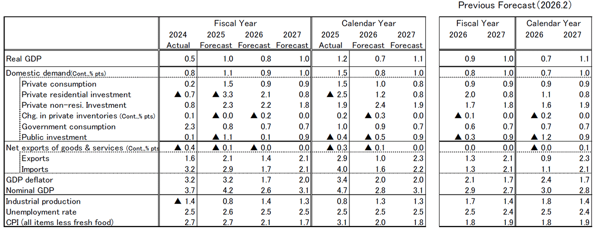 Real GDP growth is projected at +1.0% in FY2025 (February forecast: +0.7%), +0.8% in FY2026 (previously +0.9%), and +1.0% in FY2027 (unchanged at +1.0%). On a calendar-year basis, growth is expected to reach +0.7% in 2026 (unchanged) and +1.1% in 2027 (unchanged). The upward revision to the FY2025 forecast reflects stronger-than-expected growth in the second preliminary estimate for Q4 2025 (October–December). By contrast, the FY2026 forecast has been revised slightly downward to reflect the recent sharp rise in crude oil prices associated with deteriorating conditions in Iran. That said, the forecast does not assume a prolonged escalation of tensions in Iran. While oil prices are expected to remain elevated in the near term, they are assumed to gradually stabilize thereafter. In addition, a possible reduction in the consumption tax rate on food products is not incorporated into the outlook, as details remain unclear at present regarding whether it will be implemented, when it would take effect, and how it would be financed.