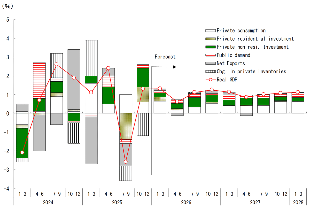 The economy is expected to recover gradually in FY2026. Two factors are likely to support Japan’s economy: the continued strength of the U.S. economy and an improvement in real household income. In the United States, the effects of interest rate cuts implemented during 2024–2025 are expected to support real economic activity in 2026 with a lag. In addition, the implementation of the Trump tax cuts will bolster domestic demand, while the negative effects of tariffs are likely to have peaked. Whereas tariff hikes and other policy measures weighed on the U.S. economy in 2025, policy factors in 2026 are expected to support growth. Demand related to generative AI is also projected to remain robust, suggesting that the U.S. economy will likely continue to perform well in 2026. Although the ongoing slowdown in China remains a source of concern, the global economy as a whole is expected to recover, supporting a gradual increase in Japanese exports. The recovery in exports should also lead to improved corporate earnings. Together with structural drivers such as investment in digitalization, labor-saving technologies, and research and development, business investment is likely to act as another engine of economic growth.