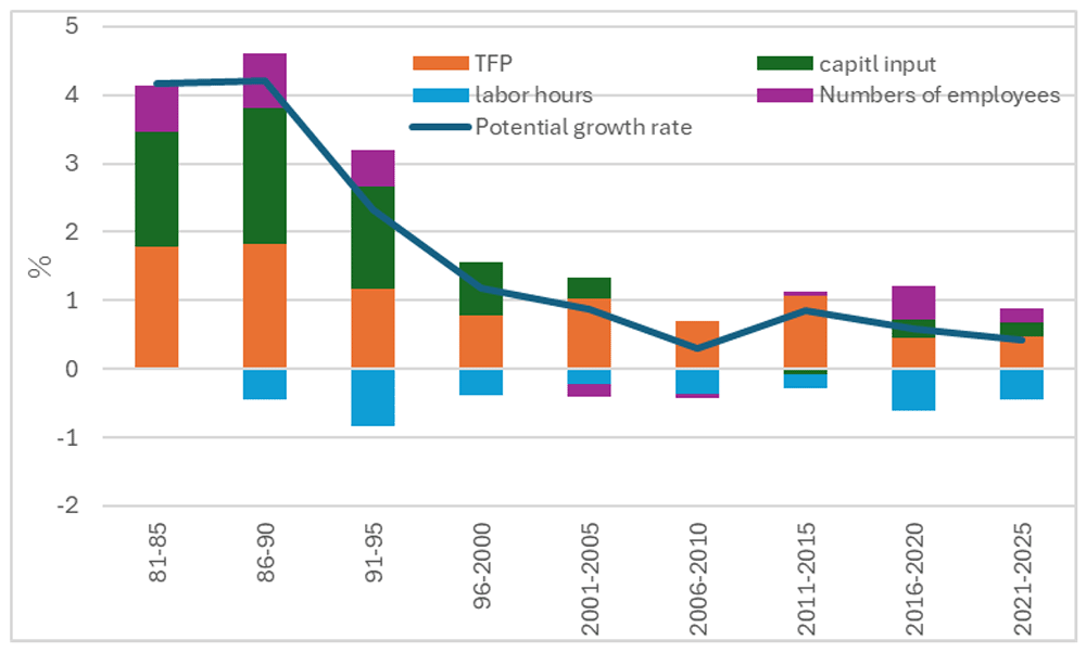 Japan possesses a strong foundation of technological innovation and labor efficiency. However, potential growth has remained low due to a lack of domestic investment and a decrease in working hours (see Figure 1). The Takaichi administration has declared a departure from excessive austerity and intends for the state to lead the way in stimulating private investment.
