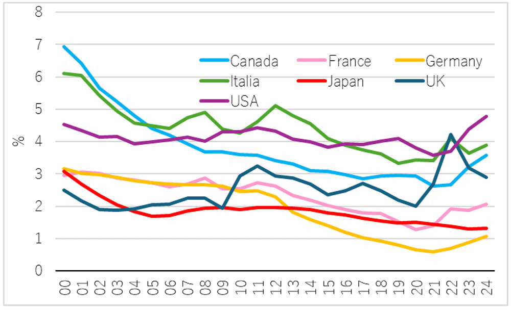 International G7 data shows a significant divergence between these indicators in the Japanese context.