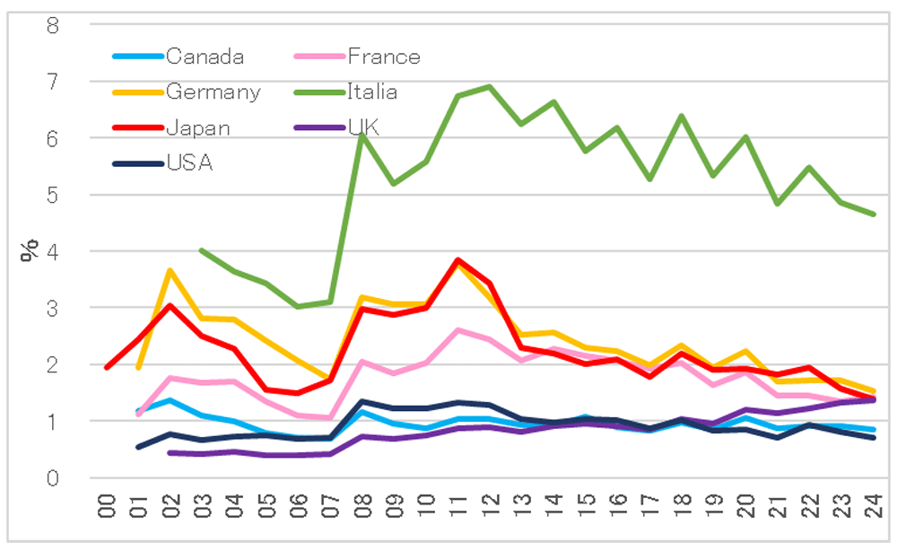 - Debt Level: While debt remains high, relative low-interest rates have kept the interest burden relative to GDP more suppressed than in other G7 nations.