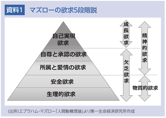 「Z世代」は、ソーシャルネイティブ世代とも呼ばれ、生まれた時からデジタルデバイスや、SNSから流れる大量の情報に接して育っている。ジェンダーや環境問題に代表される、現在の社会問題にもリアルタイムで触れ、その問題の抱える本質や世の中の共感度についても、敏感に感じることが出来る環境で育ってきた。また、テレビや車を持たないこの世代は、いわゆるモノに対するこだわりが少ない反面、人とのつながり、自身を高めるコトに対しては出費を惜しまない。マズローの欲求5段階説(資料参照)で言えば、低次の欲求よりも高次の欲求に対し、より出費をする価値を見いだしている。それは、幼いころよりネットから得た、真に美しいものや優れたもの、正しいものを追い求めてきた、彼ら独自の価値観なのだ。そんな環境の中で成長した「Z世代」は、今後どのようなキャリアを形成していくのであろうか。
