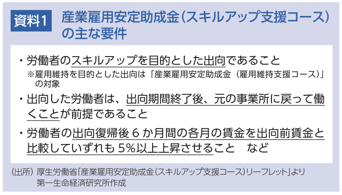 昨年10月に閣議決定された総合経済対策において「産業雇用安定助成金(スキルアップ支援コース)」の創設が明記され、同年12月に運用を開始しました。もともと「産業雇用安定助成金」はコロナ禍で業績の厳しくなった企業が雇用維持手段として在籍型出向を活用する場合に、出向元及び出向先企業に対し助成を行うものとして21年2月に創設されました。従来の形を「雇用維持支援コース」として残しつつ、「スキルアップ支援コース」では企業の業績に関係なく、働き手のスキルアップを目的に在籍型出向を活用した場合に、一定の条件のもと出向元企業を助成することとしています(資料1)。