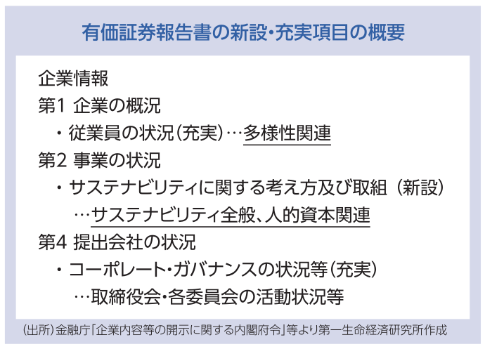 「企業内容等の開示に関する内閣府令」等の改正により、2023年3月期の有価証券報告書から、サステナビリティに関する企業の取組の記載が拡充されます。この取組には、多様性や人的資本、その他サステナビリティ全般に関することが含まれ、各企業は重要性に応じながら開示を進めることになります。