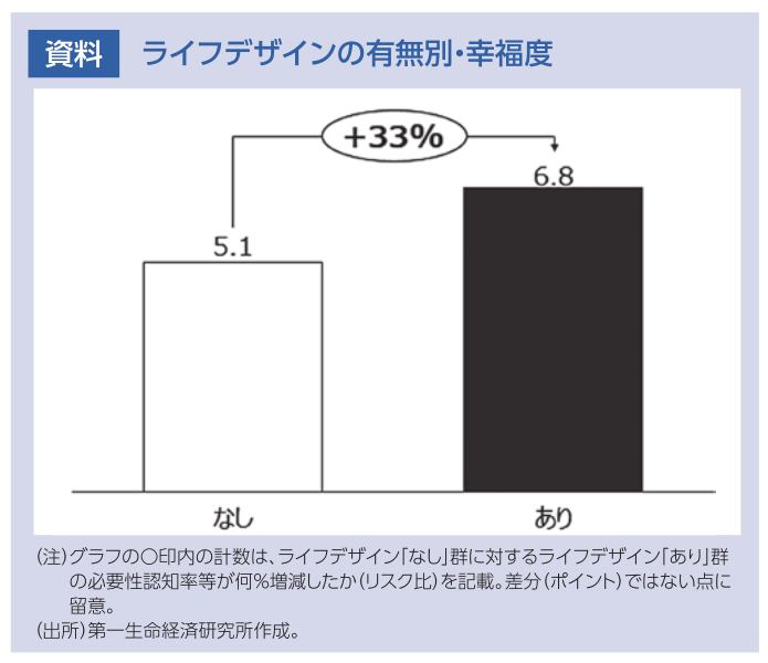 ライフデザインの有無と幸福度の関係をみると、ライフデザインを行っている人の方が、幸福度が高い傾向がある(資料)。