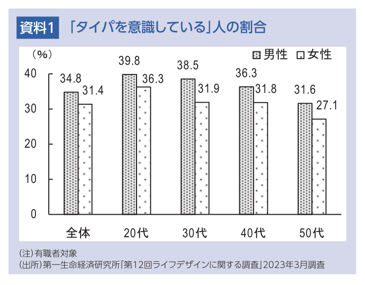 これについて、有職者を対象に性・年代別にみたものが資料1である。女性より男性の方が「タイパを意識している」割合が全年代にわたって高い。これは、就労形態や労働時間に関連するものと考えられる。パート・アルバイトよりも、正社員や公務員として働いている人の方が、また1日の労働時間が長い人ほど、「タイパを意識している」割合が高い(資料省略)。女性より男性の方が正社員や公務員が多く、労働時間も長い人が多い。こうした働き方の違いがタイパ意識にも関連していると思われる。