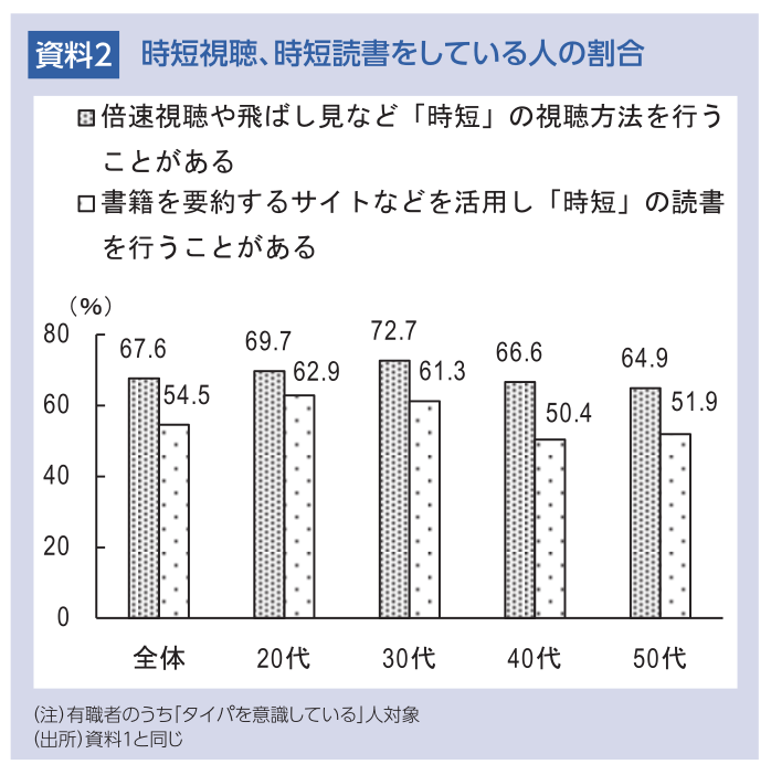 「時短読書」とは、書籍を要約するサイトなどを活用する「読書」である。こうした「時短視聴」や「時短読書」をしている人の割合をみると、タイパを意識している有職者の7割近くが「時短視聴」をしており、半数以上が「時短読書」をしている(資料2)。年代別にみると、若い年代の方が高いものの、50代でも半数以上が回答している。コロナ下で加速したデジタル化とともに若者の間で広がった「タイパ」意識・行動は、今や幅広い年代に広がり、生産性や効率性を求める価値観が社会にさらに浸透しつつあるようだ。