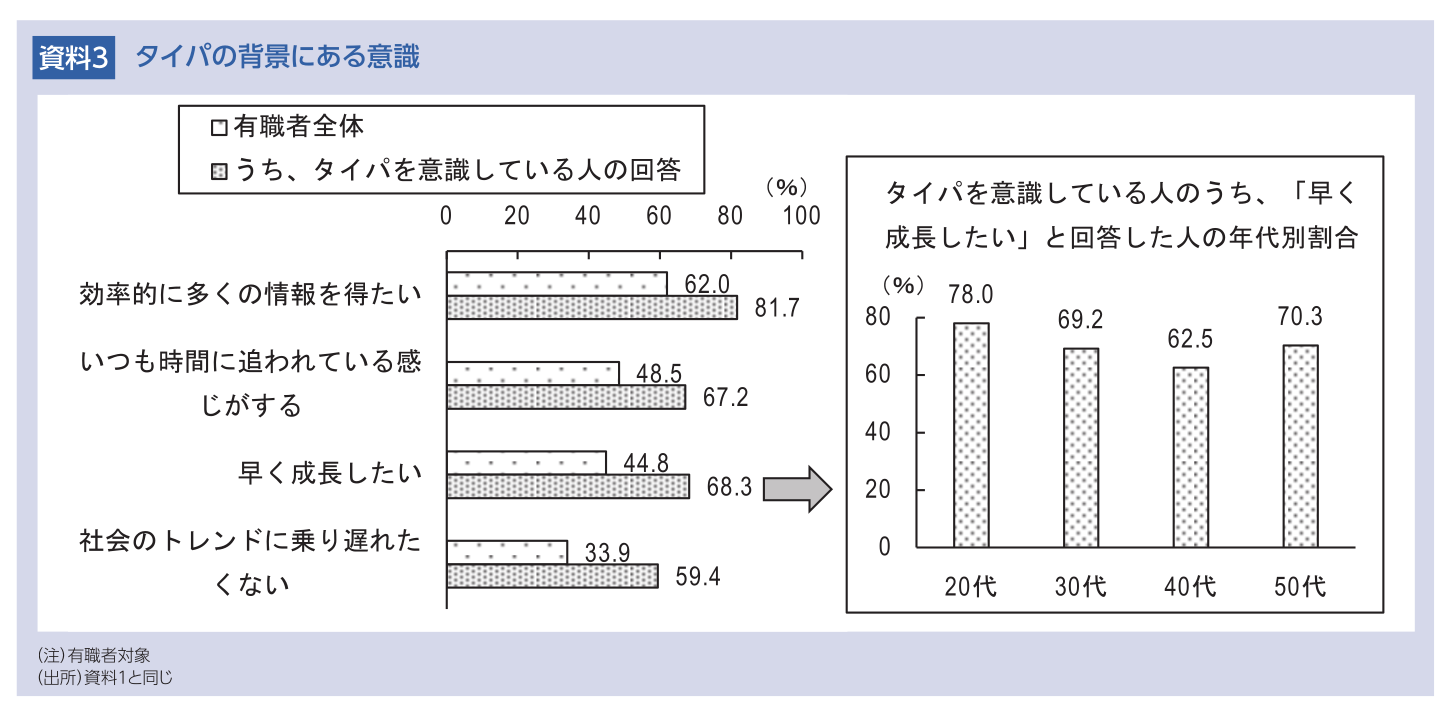 実際、有職者の生活意識をたずねた結果をみると、「効率的に多くの情報を得たい」(効率性重視)、「いつも時間に追われている感じがする」(忙しさ)、「早く成長したい」「社会のトレンドに乗り遅れたくない」(焦燥感)といった意識への回答割合が、特にタイパを意識している人は高い(資料3)。先に、労働時間が長い働き方をしている人ほどタイパを意識している人が多いことを示したが、それは、忙しいために、効率性を高めて、自分の自由になる時間を何とか捻出したいという意識が関連していると思われる。