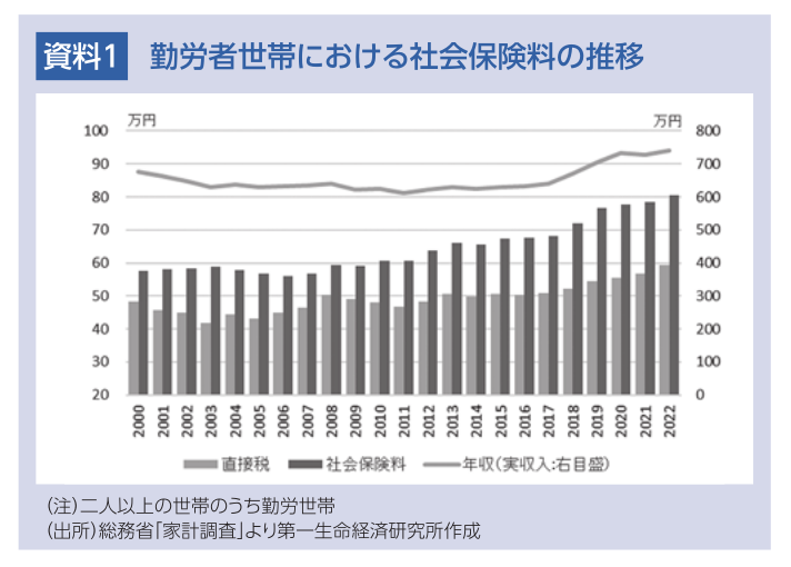 次に、勤労者世帯の家計ベースでみてみよう(資料1)。家計調査によると、2000年から2022年にかけて直接税(所得税・住民税等)は、48万円から59万円(約1.2倍)に増加する一方、社会保険料は、58万円から81万円(約1.4倍)とそれを上回る増加となっている。この間、所得は675万円から741万円(約1.1倍)と僅かしか増えておらず、所得に対する負担割合も高まっている。