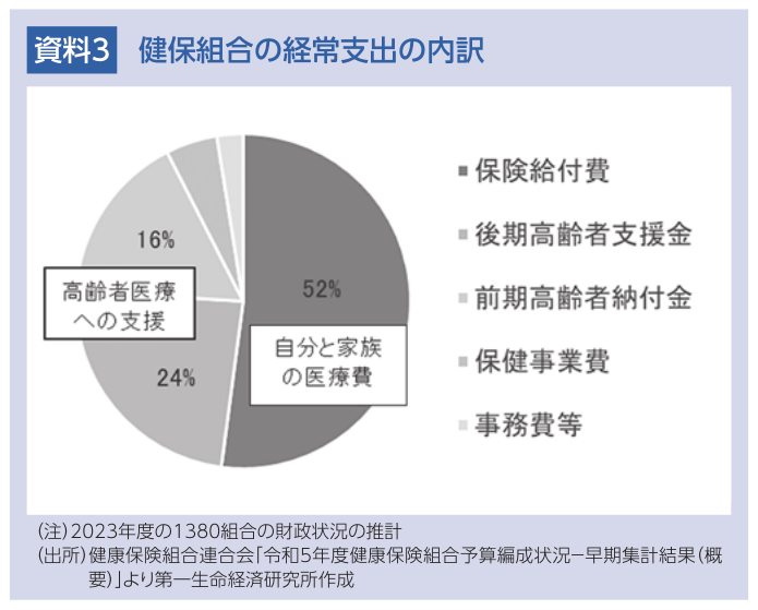 こうした実情を反映して、例えば、健保組合の保険料収入に占める高齢者医療への負担割合は平均で4割を超えており、さらに5割を超えて支援を行う健保組合も全体の2割程度ある。健保組合の平均保険料率は、高齢者医療制度が導入される前の2007年度の7.3%から2023年度には9.3%に2ポイント上昇している。