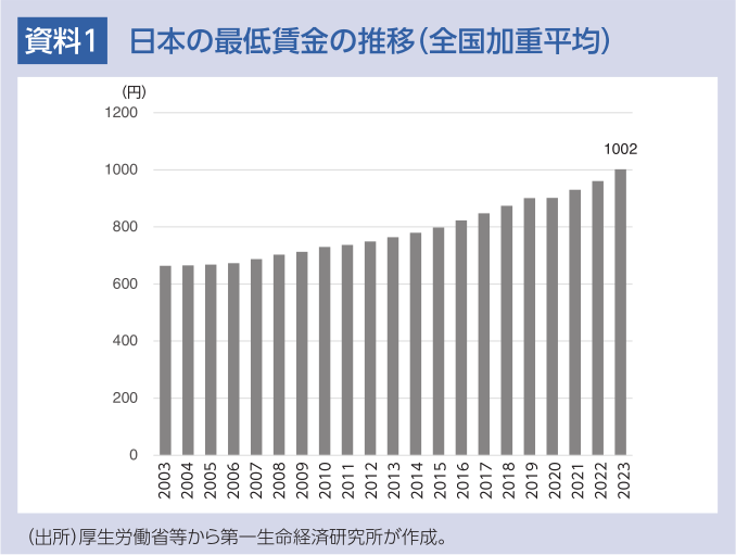 7月末、厚生労働省の中央最低賃金審議会の小委員会は2023年度の最低賃金を時給1,002円(全国加重平均)とする目安をまとめた。政府は2015年に当時798円だった最低賃金を1000円まで引き上げる目標を掲げた。約8年の歳月を経て、1000円の大台を突破した(資料1)。1000円目標を掲げて以降、最低賃金は毎年3%程度のペースで引き上げが続けられてきた。今年度は物価高や春闘賃上げ率の高まり、政府からの1000円到達に対する強い働きかけも相まって前年度比+4.3%と引き上げ率も大きい。
