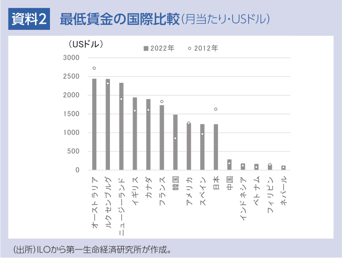 例年にない引き上げとなった最低賃金だが、世界へ視野を広げると先進国内における日本の最低賃金の低さもみえてくる。資料2はILOの統計からUSドルベースの最低賃金(月当たり)の値をプロットしたものである。日本の1,226ドルという水準は他の主要先進国に比べて低いことが見てとれる。また、同資料には2012年の値もプロットしている。多くの国では2012年に比べて上昇しているのに対し、日本はむしろ低下。この間、他国に比べて緩やかな最低賃金上昇率にとどまる中で為替の円安が進み、ドルベースでみた最低賃金は下がっている。