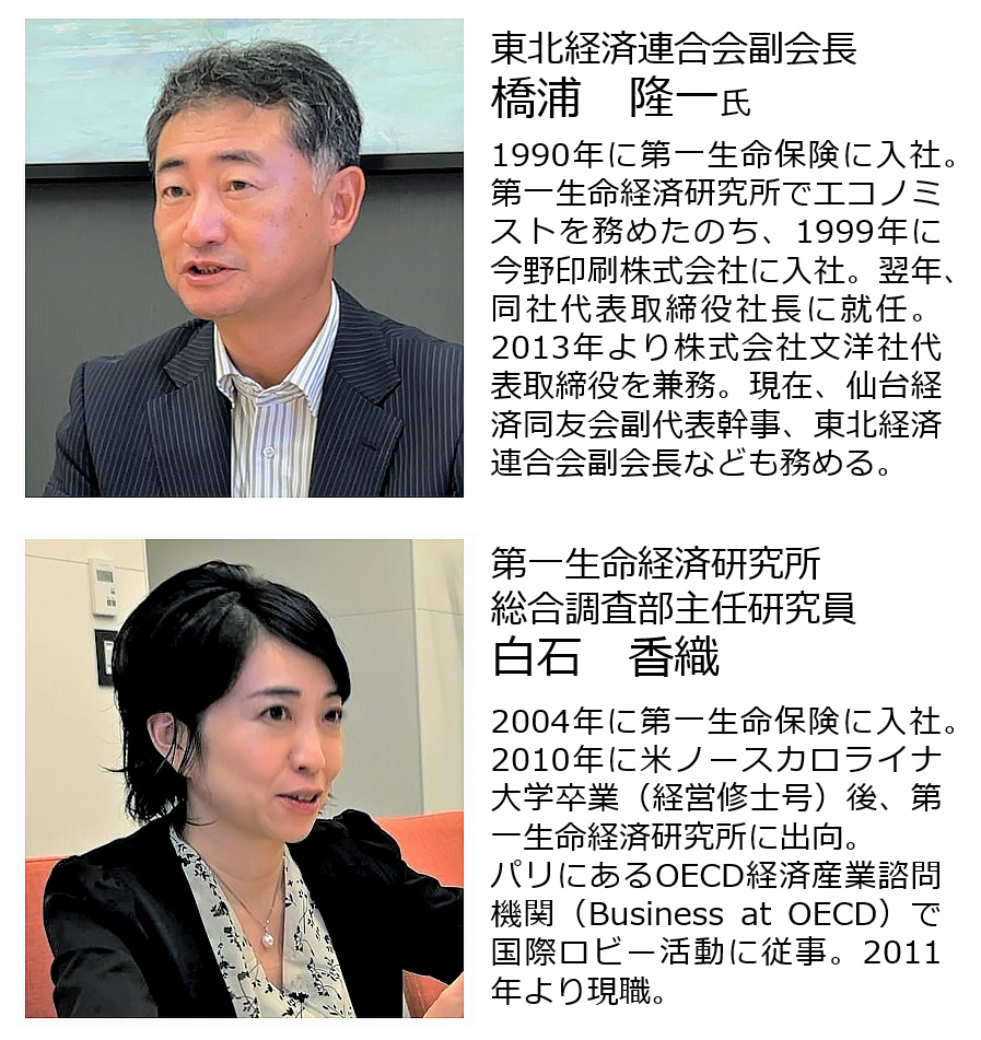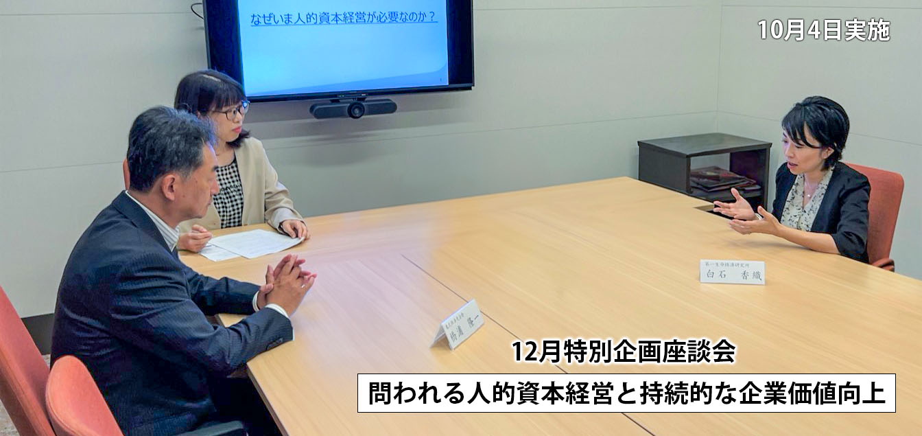 「人的資本経営と持続的な企業価値向上」は、近年でも注目度の高いテーマのひとつです。今回の経済研レポートでは、12月号の特別企画として、自らも仙台を拠点に企業を経営し東北経済連合会副会長も務める橋浦隆一氏を招き、第一生命経済研究所主任研究員の白石香織との座談会形式で、現状課題の整理と今後のアクションの方向性を探りました。