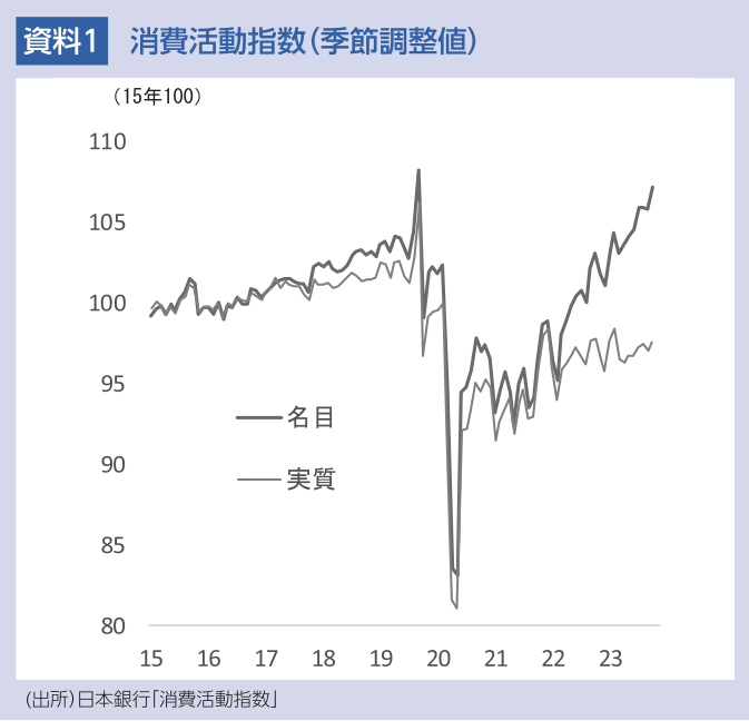 2023年7-9月期の実質GDP成長率は前期比年率▲2.9%の大幅マイナス成長となった。4-6月期に前期比年率+3.6%の高成長となった後であるため、均してみれば景気は引き続き回復傾向にあると判断できるが、これまで想定していたよりも、その回復ペースが緩やかなものにとどまっていることが示された形だ。