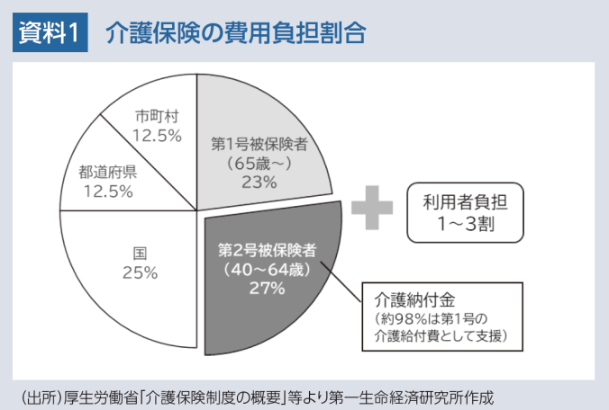 介護給付費の財源は、介護保険料が5割(第1号被保険者23%、第2号被保険者27%)、公費が5割(国25%、都道府県12.5%、市町村12.5%)を占めている。介護サービスを利用した際には、利用者がサービス費用の1割から3割を負担する(資料1)。なお、第2号被保険者のうち、協会けんぽや健保組合等の被用者保険に加入する会社員の介護保険料は、医療保険と同様に労使折半となる。