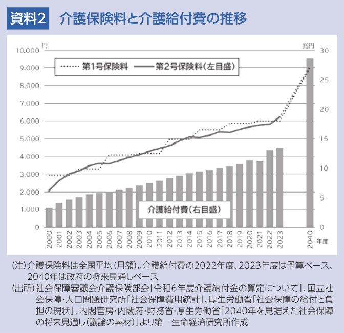 全国平均の月額保険料と介護給付費の推移をみると、高齢化に伴う介護給付費の増加とともに保険料も上がっている。政府の将来見通しに基づき2040年の保険料を概算すると、第1号・第2号ともに、月9,000円程度にまで増加すると見込まれる(資料2)。