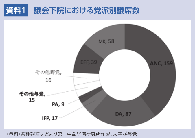 南アフリカでは、今年5月末に実施された議会下院(国民議会)総選挙において、1994年の民主化から一貫して単独での政権与党の座を死守してきたANC(アフリカ民族会議)の獲得議席数が初めて半数を下回るなど惨敗を喫した。ANCは第1党の座を守るもラマポーザ政権の維持には他党との連立が必要となり、如何なる政党と連立を組むかに注目が集まるとともに、同国の通貨ランド相場が混乱した。しかし、最終的には金融市場が期待した親欧米色が強い最大野党のDA(民主同盟)などと連立を組むことで合意し、ラマポーザ政権は3期目入りした。