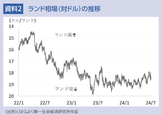 上述のように連立与党入りした各党の間には経済政策や外交政策などを巡って意見の相違が少なくないなか、今後も具体的な政策運営に当たっては今回の組閣協議と同様に各政党間での意見調整に手間取る可能性は十分に考えられる。ここ数年のランド相場は慢性的な電力不足による景気低迷が続くなか、政治的な混乱を警戒して調整したものの、足下では底打ちに転じるなど金融市場が期待したDAが加わる形でのラマポーザ政権を好感している様子がうかがえる。しかし、先行きも与党連立内では経済政策や外交政策などで隔たりが大きいなかで政策運営が混乱する可能性がくすぶり、度々調整圧力に直面する可能性には引き続き注意する必要がある。