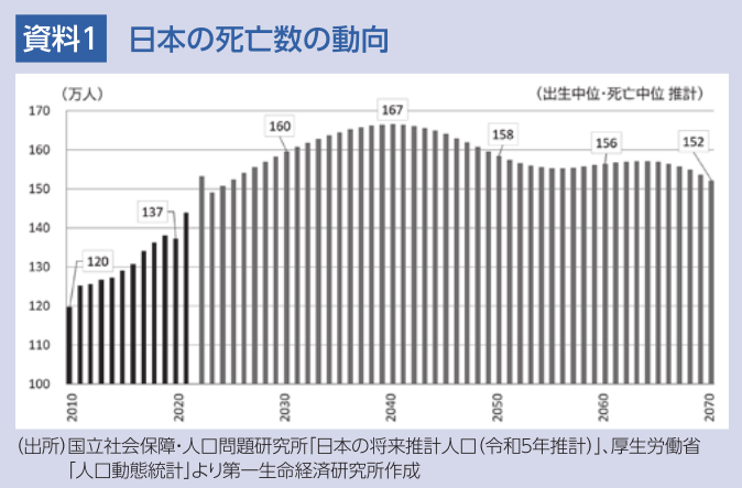 つまり、多くの高齢者が生物学的寿命を迎えることにより、今後一気に死が訪れる可能性があります。既に年間の死亡数は約140万人を突破しており、2040年にかけてさらに増加すると予測されています。(資料1)