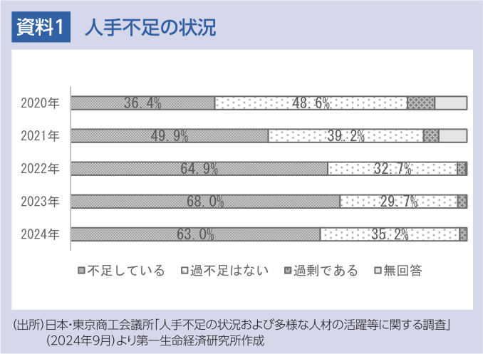 昨今、多くの企業において人手不足は喫緊の最重要課題の1つです。日本・東京商工会議所の調査によると、2024年7月時点において、人手が「不足」していると回答した企業の割合は6割超(63.0%)でした(資料1)。女性や高齢者の労働参加率も既に相当程度高まっており、また賃上げや初任給の引上げ等に力を入れている企業が多いなかでも人手の確保に苦しんでいるのが現状です。