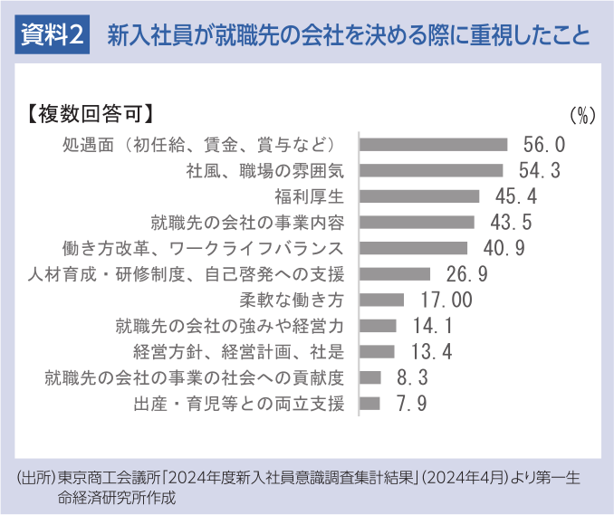 東京商工会議所の調査では、新入社員が就職先の会社を決める際に重視したこととして、「処遇面」、「社風、職場の雰囲気」、「福利厚生」が上位3つに挙げられました。また、「働き方改革、ワークライフバランス」、「柔軟な働き方」 が続いており、働きやすさを重視する人が多いことが見て取れます。さらに「人材育成・研修制度、自己啓発への支援」も上位にあり、働く企業で自己成長できるかも重要な要素です(資料2)。転職者においても、企業選びにあたって給与だけでなく、働きやすさや自己啓発を重視する傾向があることが多くの調査からわかっています。