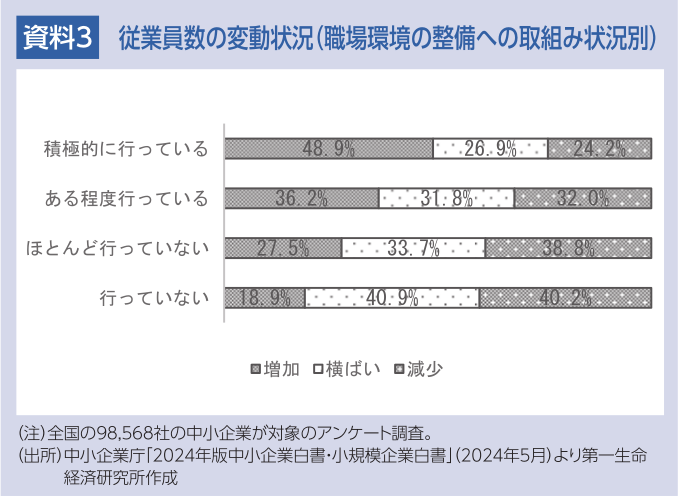企業の人材確保のための方法として、真っ先に他社に負けない賃金水準が挙げられますが、前述の通り労働者が企業選びで重視するポイントは賃金だけではありません。社員が働きやすい環境づくりも重要です。2024年版中小企業白書によると、職場環境の整備に向けた取組みに積極的である企業ほど、従業員数が「増加」していると回答する割合が高く、人材確保につながっている可能性が示唆されています(資料3)。