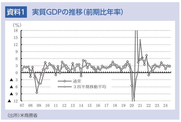 米国では、24年11月5日に大統領・議会選挙が実施され、共和党のトランプ前大統領が312人の選挙人を獲得、民主党のカマラ・ハリス副大統領の226人を上回り、再選が確定した。同時に実施された議会選挙では、11月8日時点で上院の全100議席のうち共和党が改選・非改選を含めて53議席を獲得し、過半数を上回った。民主党は45議席にとどまっている。一方、下院では、全435議席(過半数218議席)のうち共和党が212議席、民主党が201議席を獲得しており、議会は共和党が多数党となる可能性が高い。