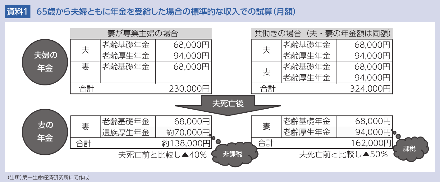 また、受給する年金が課税対象か否かの違いもある。専業主婦世帯の妻が受給する遺族厚生年金は非課税、共働き世帯の妻が受給する老齢厚生年金は課税対象であり(夫の遺族厚生年金と自身の老齢厚生年金との調整によりこの事例では自身の老齢厚生年金が選択される)、老齢基礎年金と合わせ年間概ね6万円程度の税負担となる。