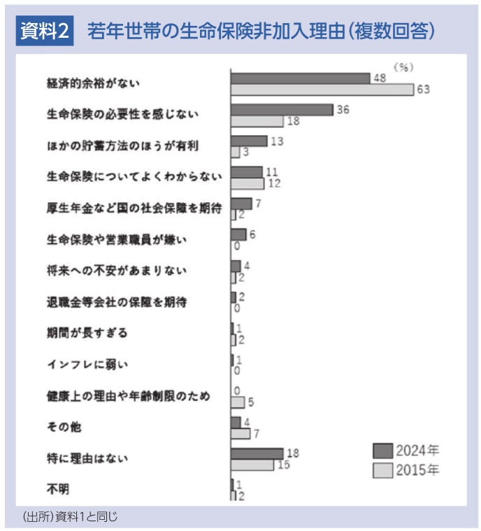 2024年と2015年の実態調査では、生命保険非加入世帯に対し、非加入理由を全く同じ質問で尋ねている。この2回の調査結果を比較して示したのが資料2である。