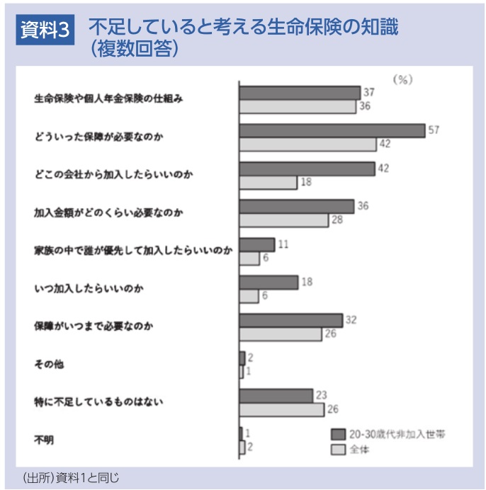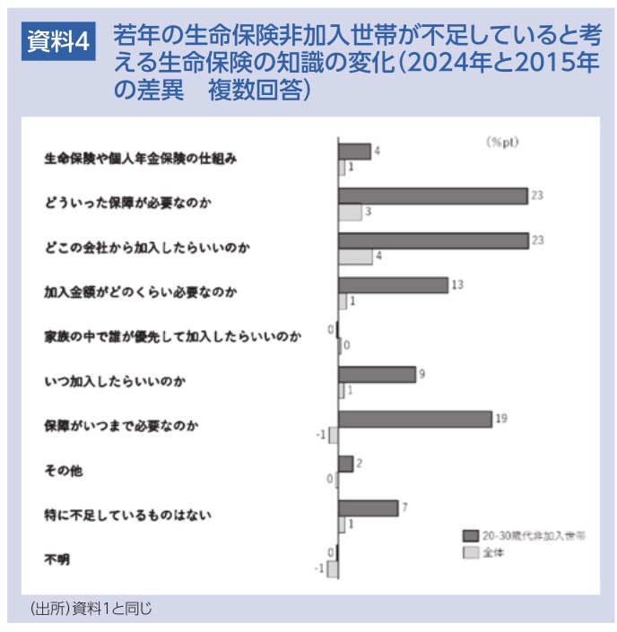 ここでは若年世帯での生命保険への理解の状況を確認する。資料3は、2024年における「不足していると考える生命保険の知識」に対する回答を非加入若年世帯と全体について示したものである。