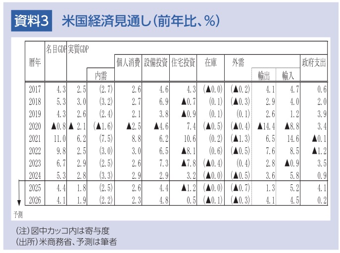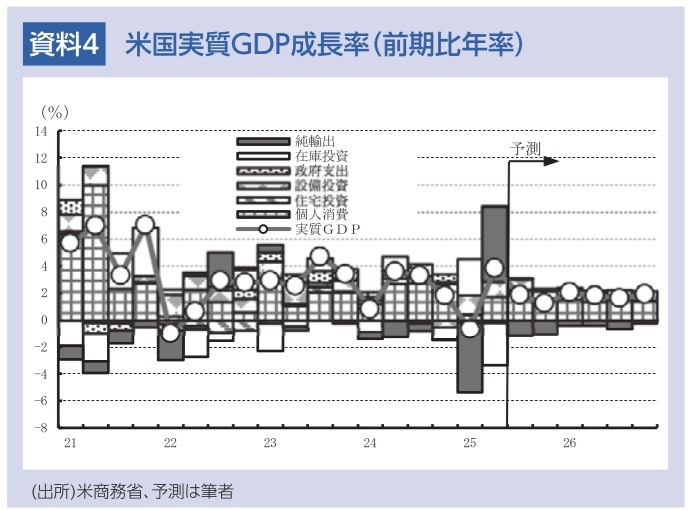 26年には、政府機関の再開による押上げや減税効果等によって、景気は再加速しよう。個人消費は、価格上昇等の影響を受けるものの、株や不動産などの資産残高の増加や減税などを背景に堅調さを維持すると見込まれる。また、設備投資は、減税効果のほか、IT需要の拡大、通商合意による不確実性の和らぎや直接投資の増加等によって、伸び率が高まろう。さらに、通商合意による農作物やエネルギーの輸出拡大も見込まれる。以上により、米経済は潜在成長率(+1.8%)を上回る成長となる公算が大きい。
