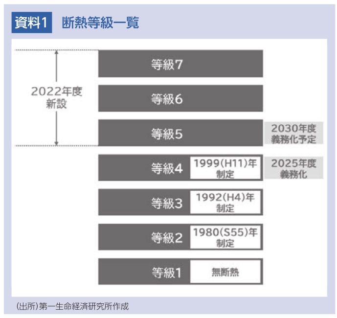 近年になって住宅の省エネ性能向上が注目され始めたものの、日本の断熱基準は主要先進国に比べ依然見劣りしている。日本はG7で唯一、2024年時点まで新築住宅の省エネ基準適合が義務化されていない国だった。2025年4月からようやく、政府は全ての新築住宅・建築物に省エネ基準適合を義務化し、断熱等級4以上を満たすことを必須とする制度改正を実施した。