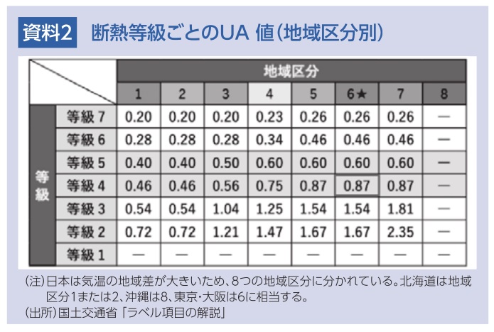 断熱性の指標として日本ではUA値(外皮平均熱貫流率)が用いられる。値が小さいほど熱が逃げにくいことを示すが、日本の断熱等級4は東京や大阪などの地域でUA値0.87W/㎡・Kにあたるのに対し、例えばアメリカ(カリフォルニア州)は日本のUA値相当で0.42という水準で、日本は最新の基準であってもカリフォルニア州の2倍以上の熱損失を許容していることになる。
