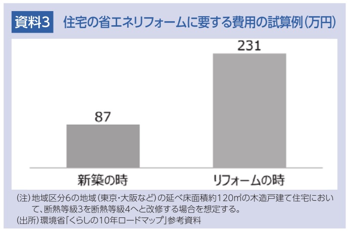 一方で問題となるのが断熱改修のコストだ。環境省が紹介する試算では、同程度の断熱性を新築時に確保する場合と比べて、既存住宅の断熱リフォームにはより大きな費用負担が生じることが示されており、一般的な戸建て住宅では数百万円規模の投資となる場合も少なくない。