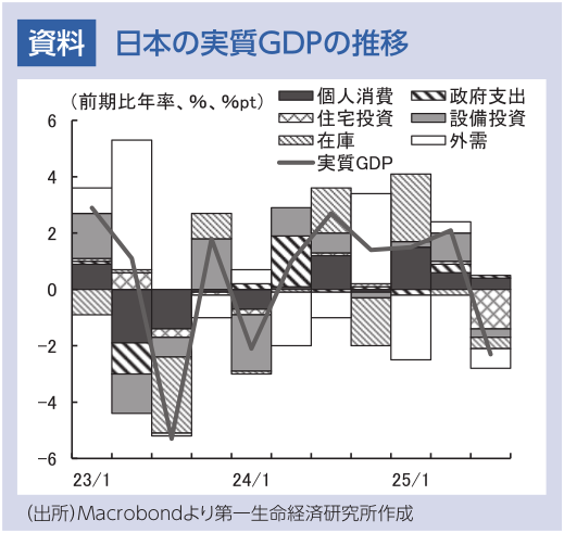 7-9月期の実質GDPは前期比年率▲2.3%(2次速報値)と、大幅なマイナス成長を記録しました。これは法改正に伴う駆け込み需要の反動で住宅投資が急減したことや、米国の関税引き上げの影響から輸出が伸び悩んだことが主な要因です。