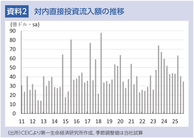ベトナム経済は、米中摩擦の『漁夫の利』を最も得てきたとされる一方、2025年はトランプ関税に翻弄された。米国は当初、ベトナムへの相互関税を46%としたが、その後の協議を経て20%に引き下げた。一方、中国による迂回輸出を念頭にした関税上乗せに加え、ベトナムは米国からの輸入品への関税をゼロとする不平等な合意となった。相互関税の本格発動を前に輸出が押し上げられたため、一時はその後の反動が懸念されたものの、輸出はその後も堅調に推移している。ベトナム政府はより良い合意の締結に向けた協議を継続しており、その帰趨は先行きの外需を左右すると見込まれる。