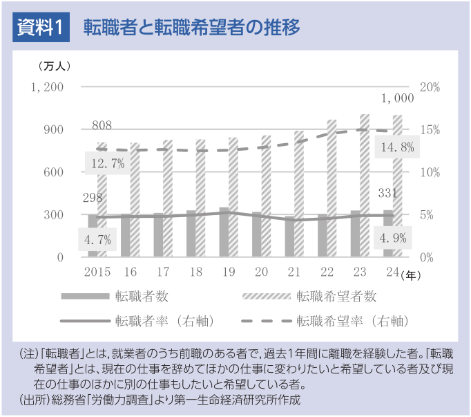 他方、転職希望者数と転職希望率(転職希望者数÷就業者数)はともに上昇基調にあり、2024年の転職希望者数は1,000万人、転職希望率は14.8%となっている。