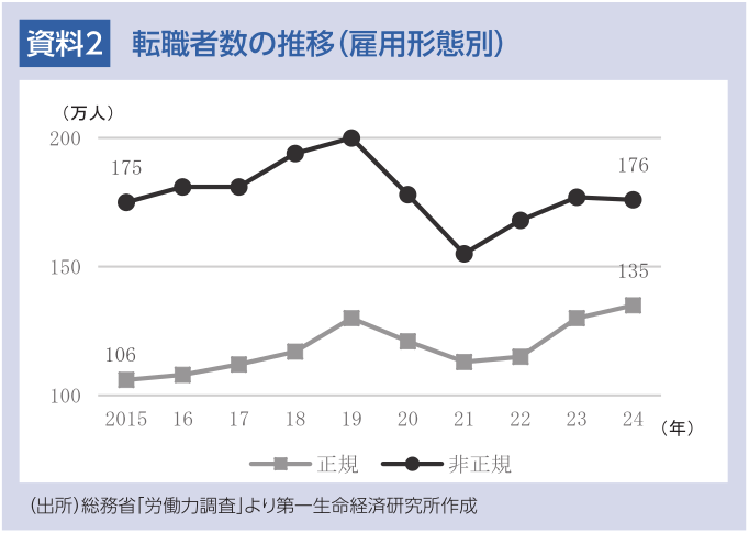 雇用形態別で見ると、非正規雇用者として転職した人数が多い傾向が続いているものの、大きな増加は見られない(資料2)。その一方で、正規雇用者として転職した人数は増加傾向にあり、直近10年間で106万人から135万人と約30万人増加している。これは全体の転職者数増加分の9割弱を占める。