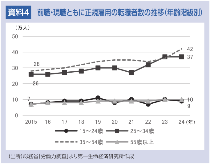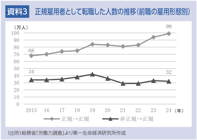 正規雇用者としての転職は、前職も正規雇用者だったケース(正規→正規)と、前職が非正規雇用者で転職により正規雇用者となったケース(非正規→正規)の2つに区分できる。資料3が示す通り、前者が増加しており、正規雇用者における労働移動が活発化していることがわかる。