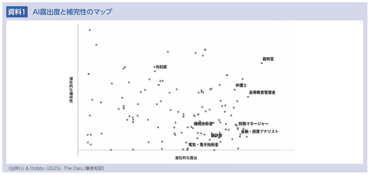 次に、AIの影響を受けることが必ずしもネガティブではない点について、カナダのシンクタンクThe Daisが2025年1月に発表した「Right Brain, Left Brain, AI Brain」の分析を参照したい。同レポートでは、職業をAIへの露出度(関わりの深さ)とAIによる補完性(助けになる度合い)の2軸でマッピングしているが、この散布図を見るとキャリアの安全地帯が浮き彫りになる。特に注目すべきは、AIへの露出度が高いにもかかわらず補完性も高い領域、すなわち「AIを積極的に活用しながらもAIに代替されにくい」職業群である。この領域には、裁判官や弁護士、高等教育管理者といった高度専門職が位置している。対照的に、AIへの露出度は高いが補完性が低い領域には、翻訳者や金融・投資アナリストなどが分布している。これらの職種は、言語変換やデータ分析といった中核業務においてAIが高いパフォーマンスを発揮するため、単なるスキル保持だけでは「AIに置き換えられる」リスクが極めて高い(図表1)。ここから導かれる戦略は、AIと競合しないためにAIから距離を置くのではなく、むしろAIを最大限に活用しつつ、AIだけでは完結できない高度な判断や責任を伴う領域を目指すべきだということである。
